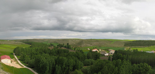 | El valle del río Franco. Se puede ver desde aquí que el pueblo se encuentra al lado de una montaña, y está rodeado por otras de igual tamaño. Pero lo más bonito es ver que todo el valle está repleto de pequeñas arboledas de chopos. Y es esto último lo que proporciona al pueblo un gran colorido. |